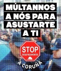 Este Mércores 26 ás 20:00h , STOP Desafiuzamentos Coruña fai un chamado á cidadanía a sumarse á concentración que se fará na casa de Isabel e Álvaro para amosar o apoio colectivo co que contan, así como a forza dun corpo social que perante as agresións políticas constantes dun Concello que goberna en contra das necesidades e intereses comunitarios e a favor da chantaxe de promotoras da construcción e especuladores profesionais. Como aconteceu o pasado xoves día 20, demostraremos que a forza e vontade da xente pode moito máis que o capricho caciquil dunha clase política encerrada no seu castelo, mais pendente de garantir o beneficio privado que de satisfacer e paliar as necesidades e carencias sociais.
