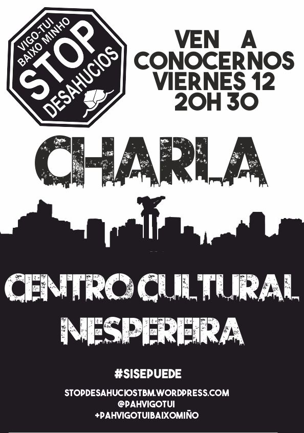 O próximo Venres daremos unha charla no Centro Cultural de #Nespereira, invitados pola Agrupación de Electores Alternativa Veciñal para informar sobre que alternativas poden ter ás familias en risco de desafiuzamento lanzados dos seus fogares por esta grande estafa que son as hipotecas.