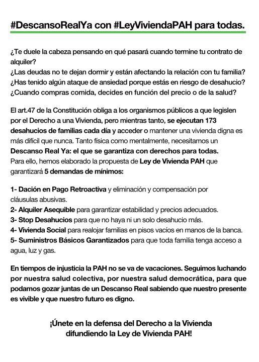 Tanto física como mentalmente, necesitamos un Descanso Real Ya. No el que se compra con créditos y deudas, sino el que se garantiza con derechos para todas con la Ley de Vivienda PAH y sus 5 demandas de mínimos: