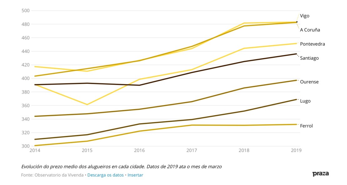 Vigo e A Coruña seguen as ser os lugares con alugueiros máis elevados,cun importe medio de 483 euros e unha suba dende o ano 2015 do 17,5% e do 16,7% respectivamente. Por detrás, a terceira cidade máis cara para alugar é xa Pontevedra, cun prezo de 452 euros e unha suba do 25,2%. Santiago, con 436 euros, é a seguinte.