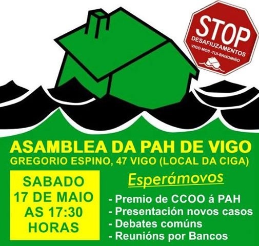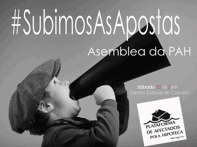 Dende o inicio da crise, en 2007-2008, foron xa 400 mil as familias que sufriron unha execución hipotecaria; moitas delas lograron ficar na súa casa grazas á presión exercida polas diferentes PAH que actúan por todo o estado. Moitas outras tiveron que abandonar o seu fogar co peto baleiro e o corpo arrasado. A PAH somos todos, persoas afectadas e non afectadas que en calquera momento poden perder o seu traballo e pasar a selo. É por iso que reclamamos a unidade do pobo para repeler o ataque ao ben tanxible máis esencial do ser humano, o seu lar, o seu recuncho, o seu refuxio. Porque a PAH é feita polo pobo, desde o pobo e para o pobo. Porque temos loitado, loitamos e non pararemos de loitar ata que cesen os abusos bancarios que, coa connivencia institucional e gubernamental, están literalmente rompendo familias e abocándoas á exclusión social, cando non á morte. Porque todos xuntos vamos ser quen de acabar con este xenocidio financeiro perverso, inxusto e cruel. Que lembren a nosa premisa: ‘Se non nos deixan soñar, non os deixaremos durmir’.