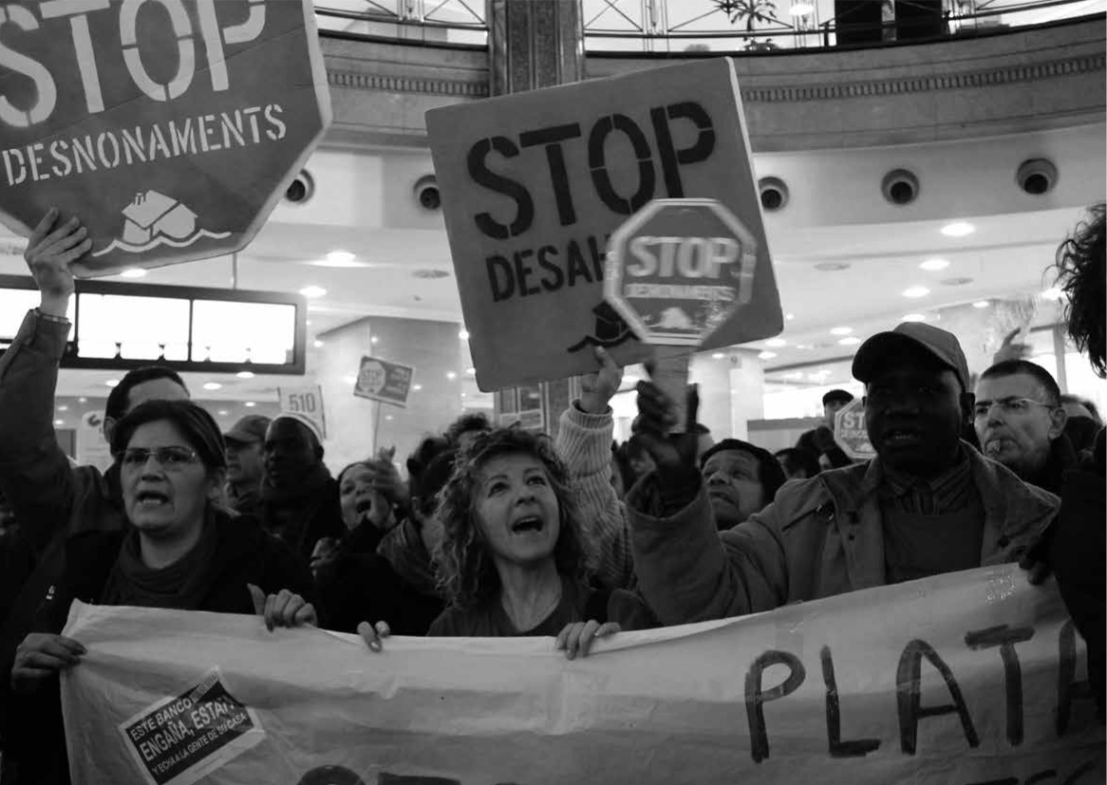 Con el estallido de las burbujas inmobiliarias y el derrumbe del merca- do nanciero en 2008, los desahucios masivos se convirtieron en un símbolo de esa crisis y, de nuevo, en un objetivo para los movimientos sociales urbanos. La señal roja de «stop desahucios» creada por el movimiento español Plataforma de Afectados por la Hipoteca (la PAH) puede verse ahora en ciudades de otros países como símbolo de la 16 lucha contra los desahucios.
