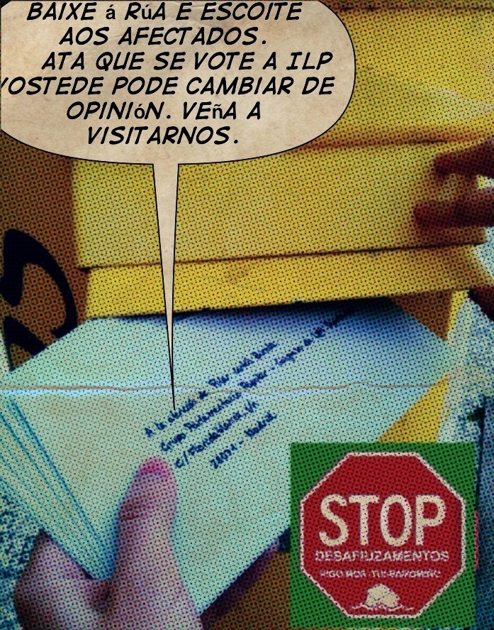 A ILP tramitouse e vostedes teñen que presentar enmendas para posteriormemente votala no Congreso. Poden respectar as demandas de mínimos recollidas na ILP, ou amplialas. Tamén poden votar a favor de perpetuar os privilexios da banca. Pero votar a favor da ILP bríndalle unha nova oportunidade para acabar con este drama social, estar á beira do pobo e recuperar parte da lexitimidade perdida. Votar en contra ou rebaixala convérteo, aos ollos da maioría, en responsable directo do sufrimento e a dor de miles de familias deste país. Apelamos á súa conciencia persoal e á súa humanidade ante o sufrimento e a vida da xente. Baixe á rúa e escoite aos afectados. Ata que se vote a ILP vostede pode cambiar de opinión. Veña visitarnos. Se non pode, teremos que achegarnos nós