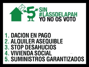 Ahora Exigencias PAH entra en una nueva fase. Hemos tocado todas las puertas, pedido reunión con partidos, presentado mociones e interpelado a los Parlamentos. Hemos demostrado tras seis años de lucha que Si Se Puede legislar para la ciudadanía con la aprobación de la ley 24/2015. Este es el momento de dar un paso más y exigir 5 demandas de mínimos para abordar la emergencia habitacional y conquistar el derecho a la vivienda en todo el Estado. Ahora nos dirigimos a toda la ciudadanía, para que conozca éstas demandas y para que le diga a los partidos políticos: “Sin las 5 de la PAH, Yo no os voto”.