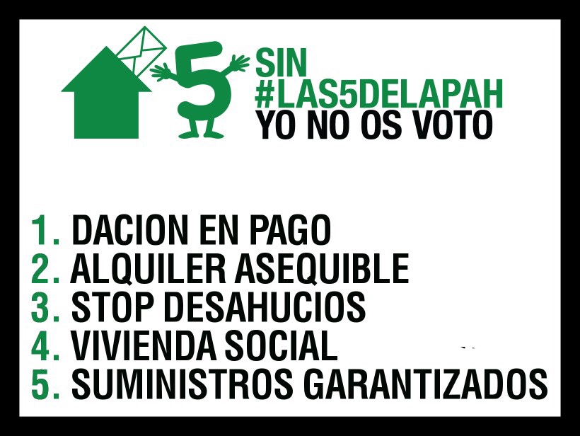 Ahora, frente a las elecciones, muchos partidos instrumentalizarán el drama que hemos combatido. Venderán cortinas de humo y propuestas electoralistas. No lo permitiremos. Existen soluciones. Ya hemos demostrado que son reales en Cataluña con la Ley 24/2015. Ahora tienen que extenderse a todos los niveles del Estado. Y con su apoyo, dejaremos muy claro a los partidos políticos que sea quien gobierne tras las elecciones del 20 de diciembre, estaremos llamando a su puerta desde el primer día. Somos la PAH: familias que luchan por los derechos de todas. Y sin ninguna duda de que ganaremos, repetiremos cada día cada una de nosotras que Sin las 5 de la PAH, Yo no os voto. Porque Sí Se Puede.