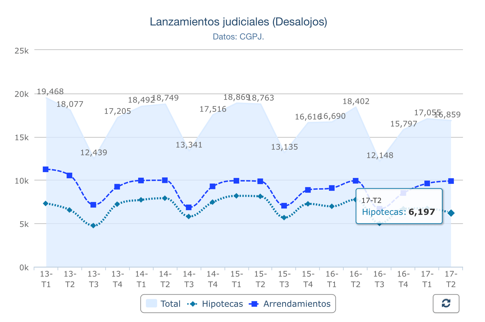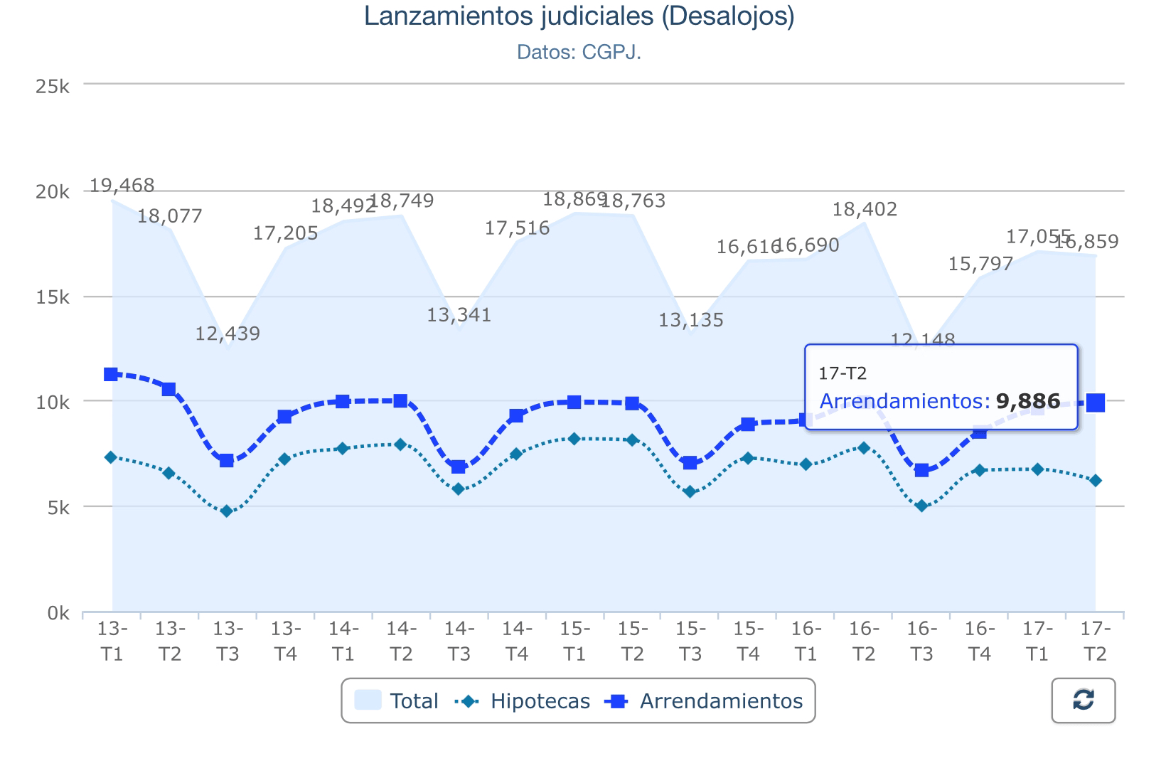 Concretamente, el 58,6% de esos lanzamientos, 9.886, fue consecuencia de procedimientos derivados de la Ley de Arrendamientos Urbanos (LAU); mientras que el 36,8%, otros 6.197, se derivó de ejecuciones hipotecarias,