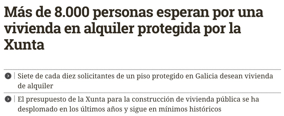 Ademas a porcentaxe de vivenda en propiedade foise reducindo e a preferencia é cara Aluguer ,pero que este «mercado» ,esta opción , está maioritariamente en mans de Grandes Garfos de Vivenda e sobre todo dos Fondos Voitre, temos en definitiva un panorama de total desproteción dos inquilinos a mercé dunha realidade que lles aboca a ter un Caseiro implacable ,con sede en N.York ou Wall Street ou dun mercado onde non existe nada escrito ,nin contratos ,nin recibos,nin reglas É a indefensión das Inquilinas é a hora de unirse ,e de fixar as novas regras de xogo