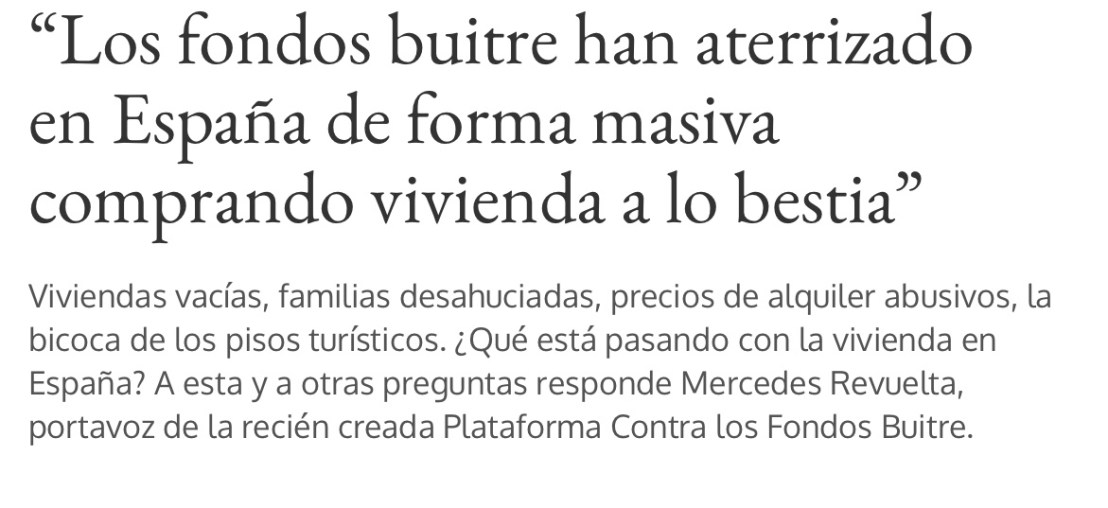 Muy recientemente Bankia, banco actualmente público, se desprende de suelo y casas que podrían haber servido para empezar a generar Parque hoy inexistente, y lo vende a precio de saldo a fondos. Dentro de poco España estará en manos de esos buitres. Esta situación debe revertirse, porque los activos y el banco rescatado son necesarios para hacer frente a la situación de emergencia habitacional que padecemos.